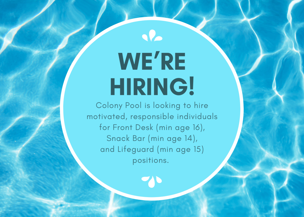 Lifeguards: Required to have Red Cross Lifeguard Certification prior to May 21, 2026. Colony Pool specific orientation to be held around that time. Must be a minimum of 15 years old.
